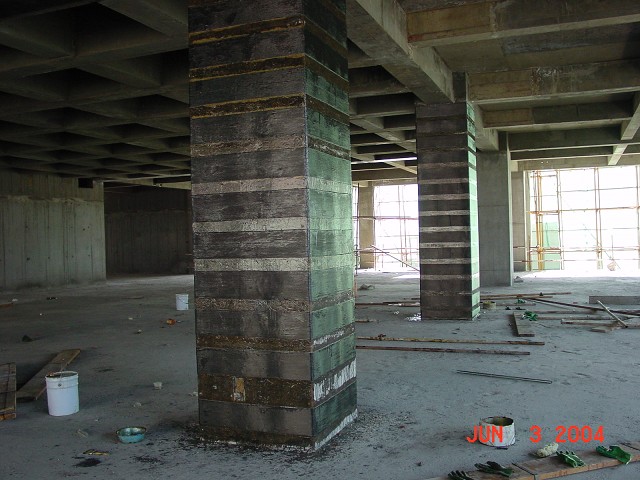 濟(jì)南永安大廈部分框架柱、梁采用粘貼碳纖維加固處理,現(xiàn)澆板收縮裂縫采用灌縫處理。