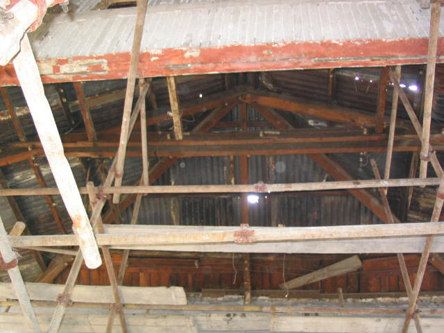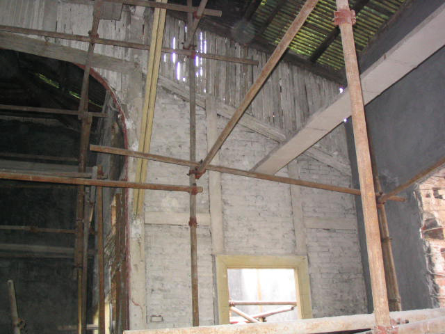 小廣寒影劇院原結構為磚、石、木、鋼混和結構。墻體由亂石、粘土磚用粘土、石灰雜砌而成,中間為鋼柱-鋼梁支撐,屋架為木結構,屋面為鐵皮屋面。室內頂棚為板條麻刀粘土石灰頂棚,隔墻為木柱、木腰梁半磚隔墻??磁_為木結構看臺,木樓梯。小廣寒影劇院因年久失修,磚石墻、屋架、看臺、隔墻等大部分已破損、腐爛。本次修繕工作本著“修舊如舊”的原則,對建筑物進行了針對性的改造加固