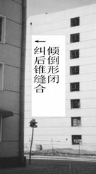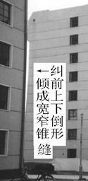 采用掏土灌水法設(shè)計(jì)施工的該項(xiàng)工程,糾傾工作共進(jìn)行了2個(gè)月。各觀測點(diǎn)傾斜值全部已回至規(guī)范要求范圍,內(nèi)外縱墻原有裂縫大部分已閉合。從糾傾前照片可以看出,傾斜樓房山墻與鄰近參照建筑物墻體間在垂直方向上形成了上寬下窄的倒錐形縫,糾傾后建筑物與參照建筑物間的倒錐形縫已閉合(圖2)。