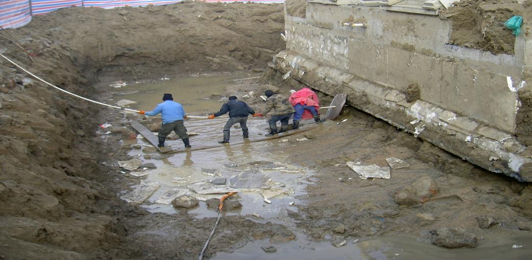 (4)在基礎(chǔ)墊層底面以下0.3m設(shè)置水平掏土孔,掏土孔水平間距為0.5~1.0米;掏土孔水平深度根據(jù)各樓的傾斜情況及荷載重心位置綜合確定。采用射水法加快掏土糾偏的速度,見圖17。掏土的遍數(shù)根據(jù)現(xiàn)場(chǎng)觀測(cè)情況確定。經(jīng)過(guò)20天的糾傾施工,經(jīng)測(cè)量,建筑物的傾斜滿足規(guī)范要求。