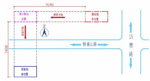 2000年底,為了不影響新規(guī)劃的“臨沂市人民廣場”的建設(shè),同是也為了節(jié)省投資、減少污染,將其先向西平移96.9m,再向南平移74.5m,總移動(dòng)距離171.4m,平移共用25天,平均速度為1.5-2.0m/h。