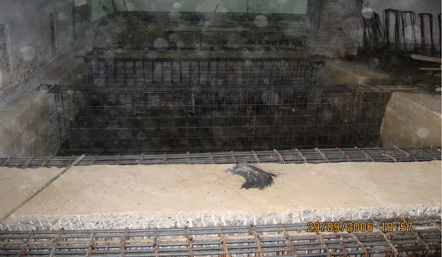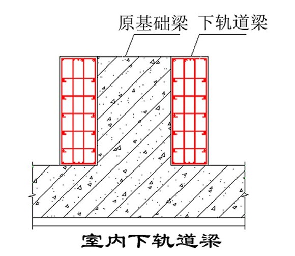該建筑物的原基礎(chǔ)是筏板基礎(chǔ),平移時(shí)利用原有的基礎(chǔ),將縱向基礎(chǔ)梁兩側(cè)加寬,既是對(duì)原基礎(chǔ)進(jìn)行加固,又可控制新舊基礎(chǔ)的沉降差。