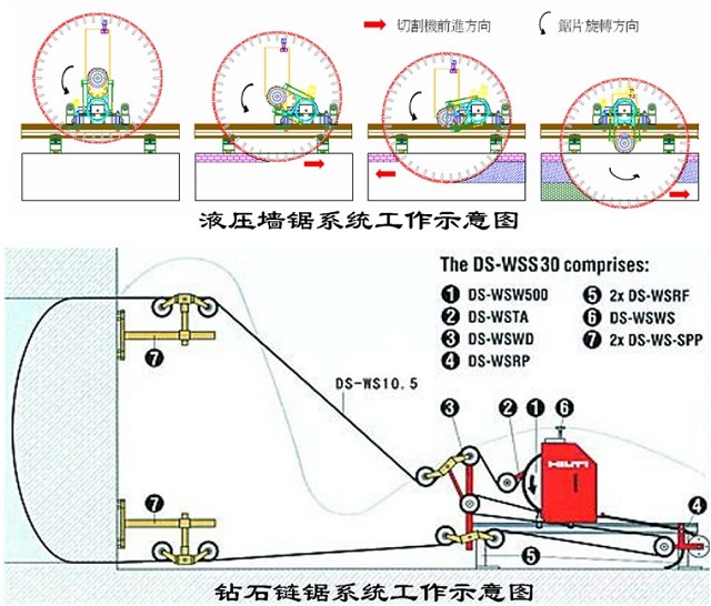 柱截?cái)嗖捎勉@石鏈鋸系統(tǒng);墻體截?cái)嗖捎冒胱詣?dòng)推進(jìn)式墻鋸系統(tǒng)。