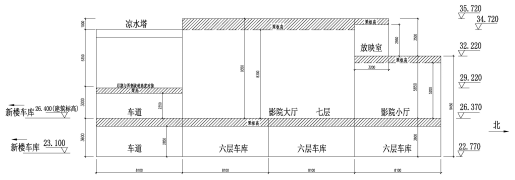 根據(jù)經(jīng)營要求,建筑物東側(cè)單體需進(jìn)行加層改造,加層后,原五層頂屋面變?yōu)榱鶎?,作為車庫或?jīng)營使用,原五層新世紀(jì)影城搬遷至新建七層。加層設(shè)計時,結(jié)構(gòu)標(biāo)高布置需在滿足影廳凈高要求的同時兼顧新加樓層與周邊建筑物車道的交通銜接、屋頂涼水塔、影院放映廳、已有樓梯、電梯等,平面、剖面布置較為復(fù)雜,剖面見圖2。