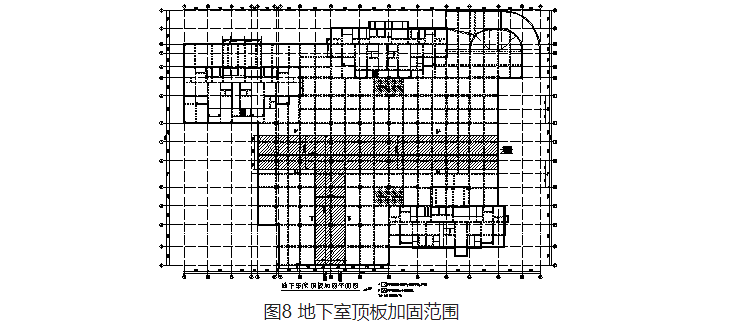 車庫頂板東西向存在兩條通長大裂縫,南北向也有兩條較長裂縫。將裂縫區(qū)域的板加厚10cm,即在板頂增設(shè)10cm鋼筋混凝土層,對板進(jìn)行加固,同時提高梁端截面的承載力,加固范圍見圖8。對底部開裂的板,灌縫后采用粘貼碳纖維方法進(jìn)行加固。