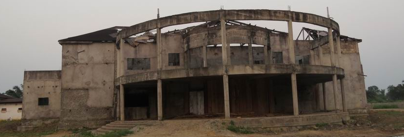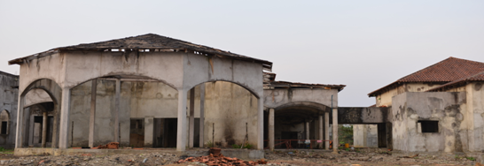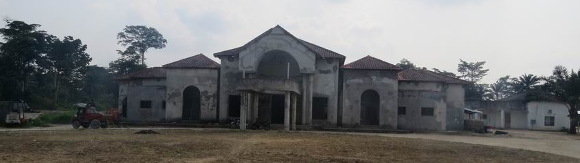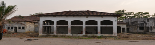 伊豐度總統(tǒng)行宮項目為2006年剛果(布)國慶配套工程,占地101200m2,由一個主樓加上兩個單層別墅組成。其中1#主樓建筑面積為2700 m2,主體為一層、局部二層,一層層高約為5米,大廳處層高約為8米,結(jié)構(gòu)形式為混凝土柱、梁及150厚空心砌塊墻承重,木屋頂結(jié)構(gòu)(局部現(xiàn)澆板屋頂),見圖32~35?,F(xiàn)大部分圖紙缺失,混凝土強度等級、砌體材料強度等級不詳。該國建筑物不考慮抗震設(shè)防要求。2006年由本地建筑單位承建,由于各種原因中途停工至今,現(xiàn)剛果(布)大工委指派威海國際經(jīng)濟技術(shù)合作股份有限公司進行維修與續(xù)建,項目組對現(xiàn)狀進行勘察后發(fā)現(xiàn)該工程施工質(zhì)量差,且長時間暴曬雨淋導(dǎo)致屋架腐爛、梁柱板鋼筋嚴(yán)重銹蝕,存在重大安全隱患,為保證結(jié)構(gòu)安全,委托我所對該工程進行鑒定并出具加固方案。