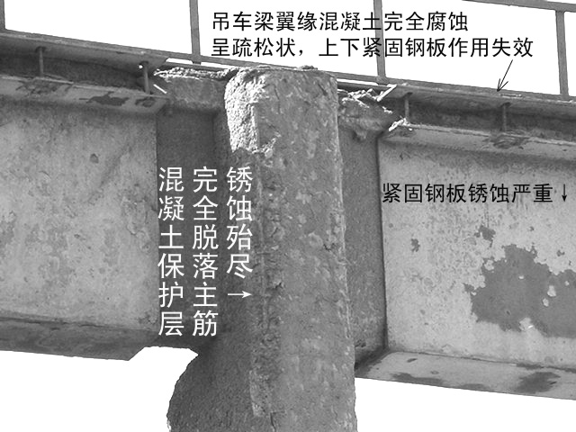 濟(jì)南鋼鐵廠(chǎng)除渣車(chē)間,吊車(chē)梁鋼筋銹蝕,混凝土疏松。通過(guò)我所對(duì)其進(jìn)行鑒定及加固,滿(mǎn)足了安全使用要求。
